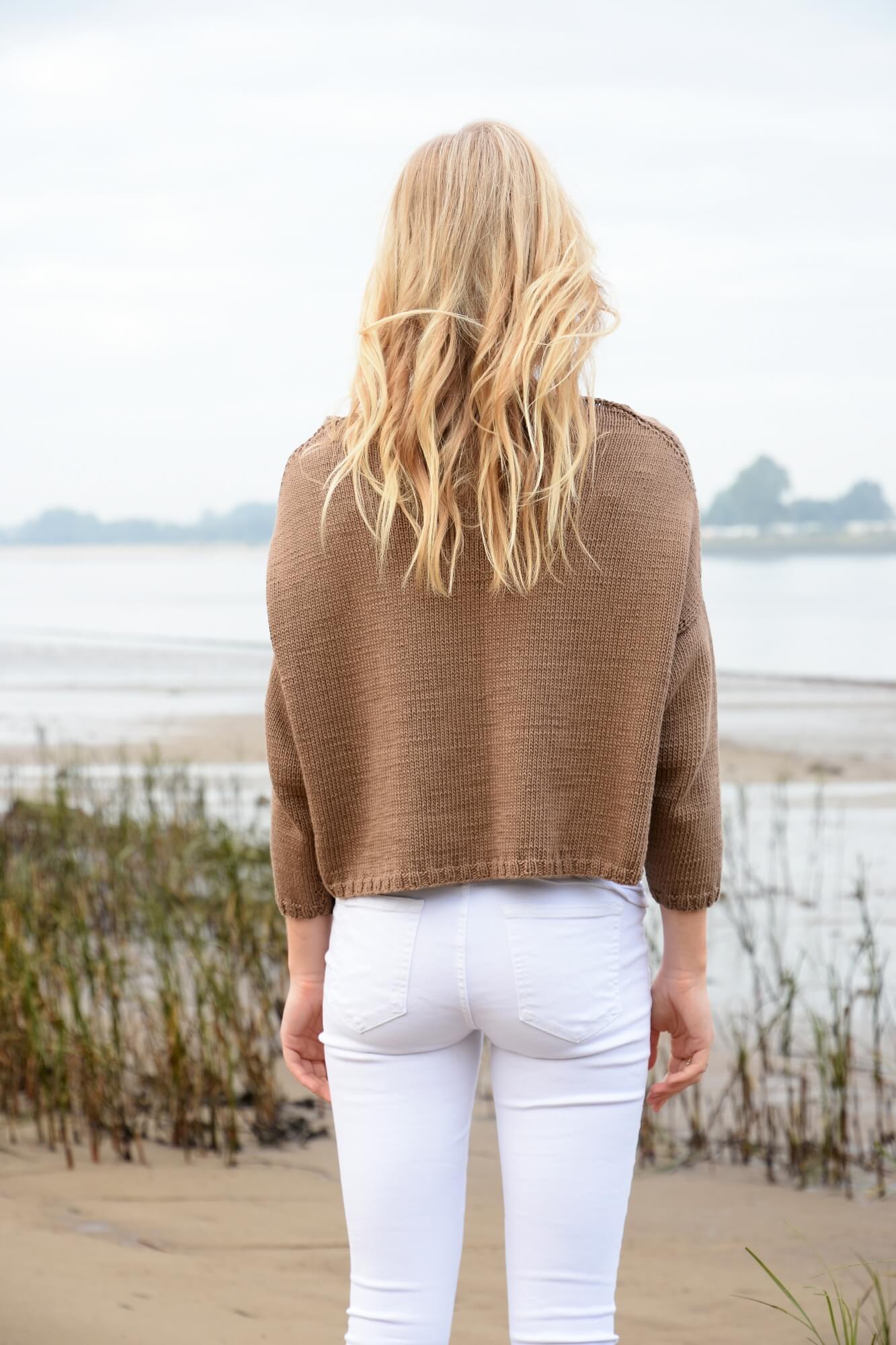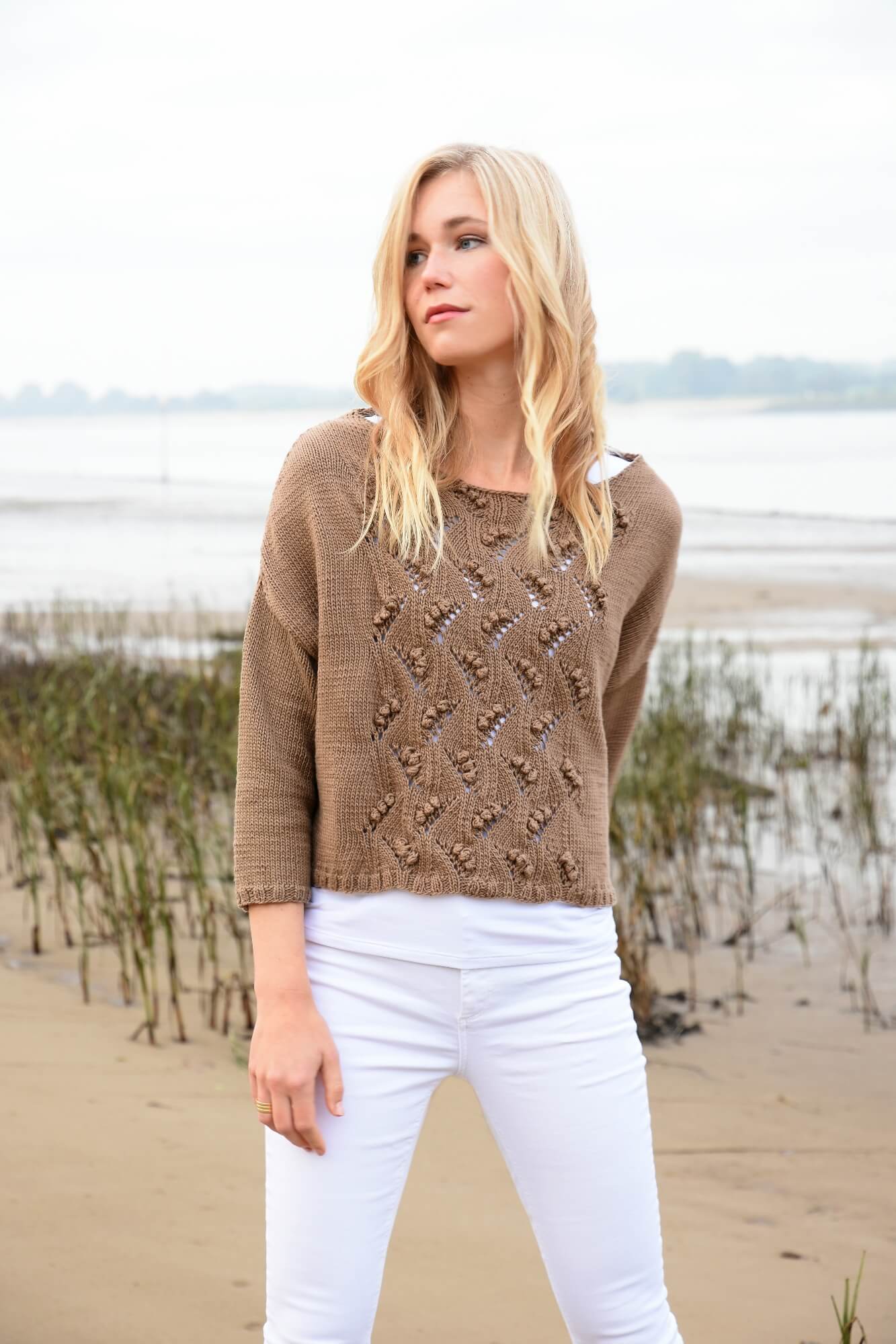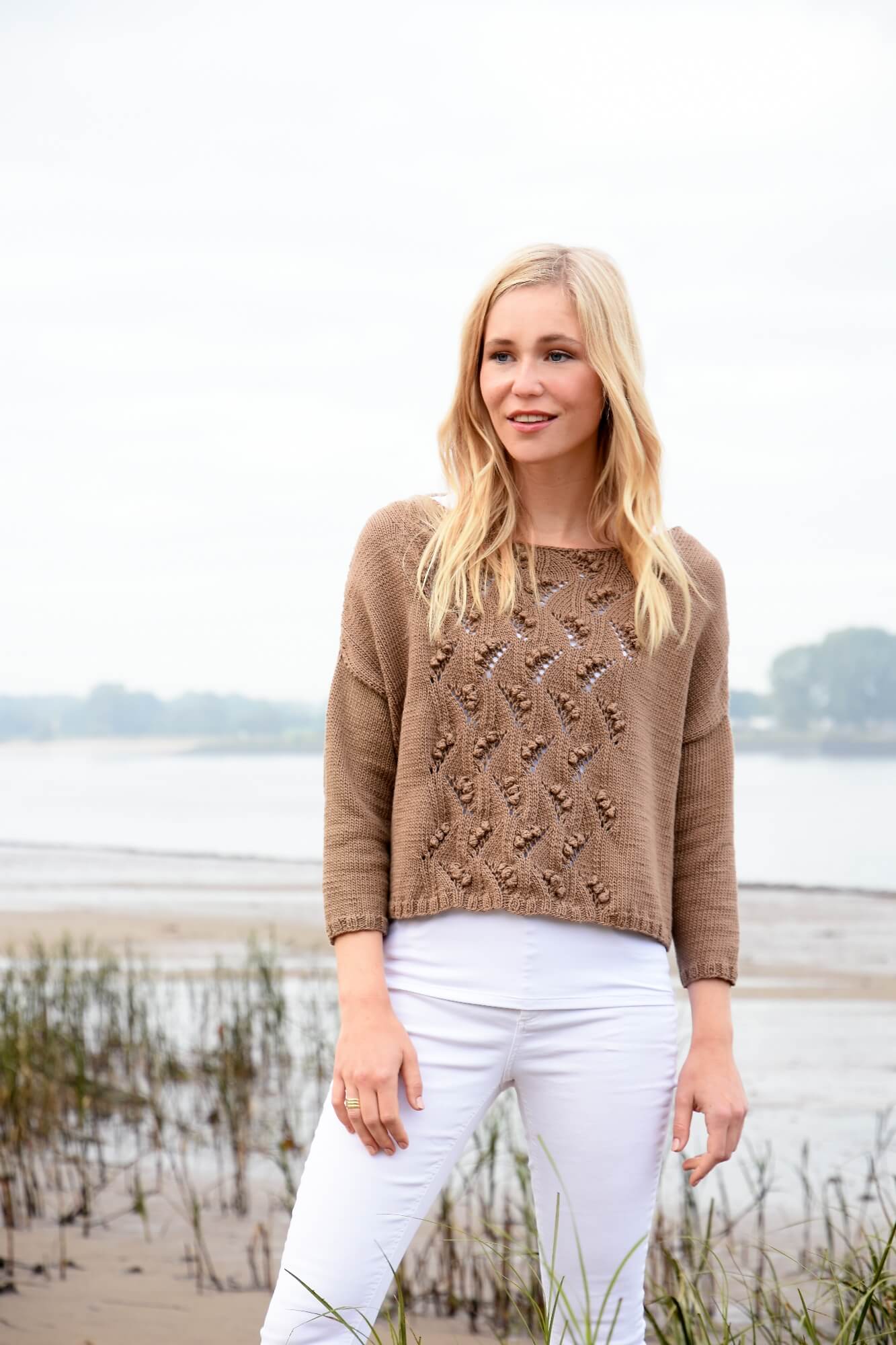 Pullover Mia hat einen oversized, kastigen Schnitt und wirkt durch die Rippenbündchen sportlich. Das Besondere an diesem Modell ist das Lochmuster im Vorderteil.