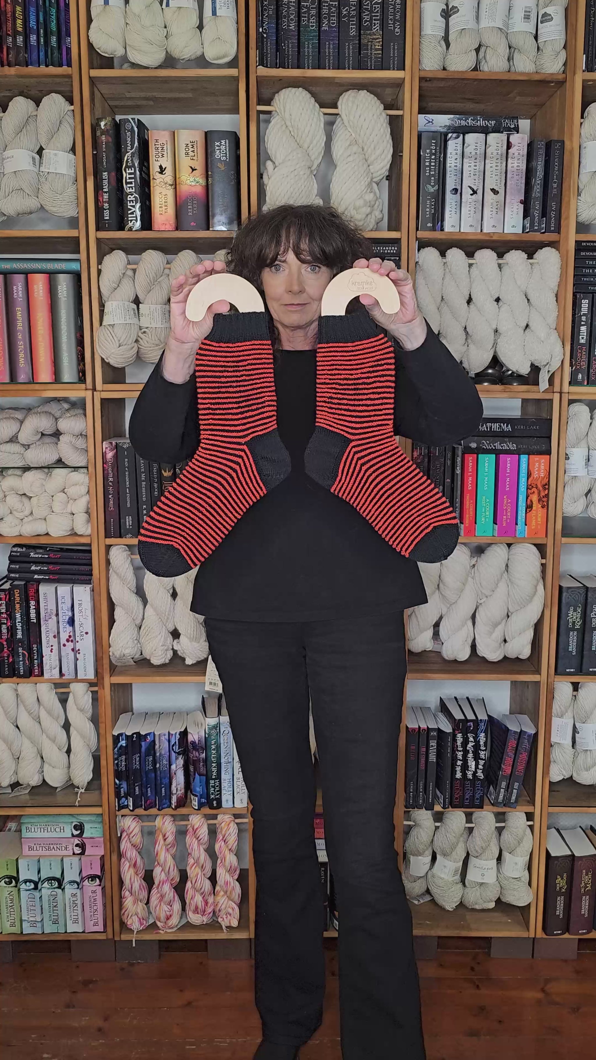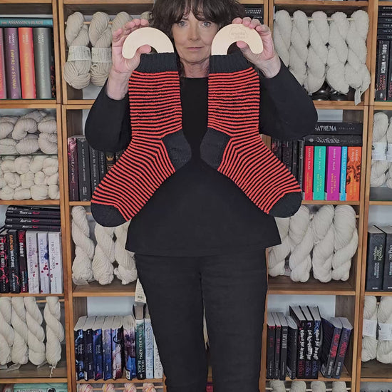 Illusionsstrickmuster von einer Spinne und einem Geist auf Socken im Schattenstrick, inspiriert von Romantasy- und Dark Romance-Literatur.